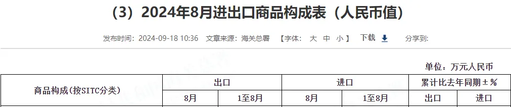 近日,海關(guān)總署公布2024年前三季度進(jìn)出口數(shù)據(jù),以美元計(jì),中國(guó)9月進(jìn)口同比0.3%,預(yù)期0.9%,前值0.50%;出口同比2.4%,預(yù)期6%,前值8.70%。中國(guó)9月貿(mào)易帳817.1億美元,預(yù)期898億美元,前值910.2億美元。雖然看起來(lái)仍是正值增長(zhǎng),但比前值有所下滑,且不及預(yù)期。值得注意的是,這是已知的本年度出口增速最低月份,同時(shí)9月出口同比回落至2024年2月以來(lái)的最低值。