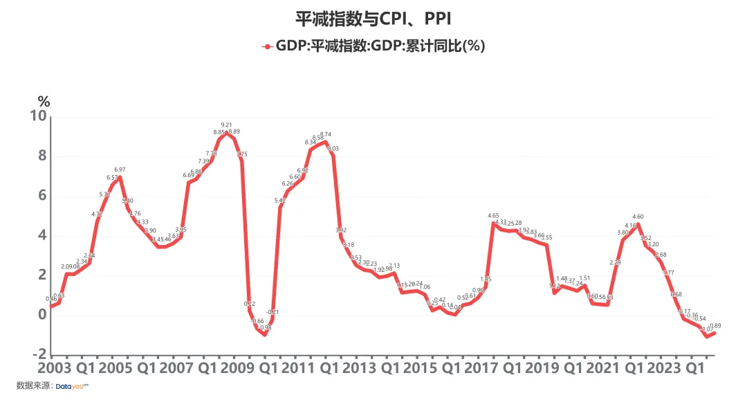 正如人民銀行前行長(zhǎng)易綱所言,中國(guó)面臨內(nèi)需疲軟的問(wèn)題,尤其是在消費(fèi)和投資方面,“中國(guó)現(xiàn)在應(yīng)該把重點(diǎn)放在抵擋通縮壓力上”。GDP平減指數(shù),已經(jīng)連續(xù)5個(gè)季度為負(fù)。上一次出現(xiàn)GDP平減指數(shù)為負(fù)還是08年金融危機(jī)的時(shí)候,而且只有3個(gè)季度短暫為負(fù),然后迅速回升。