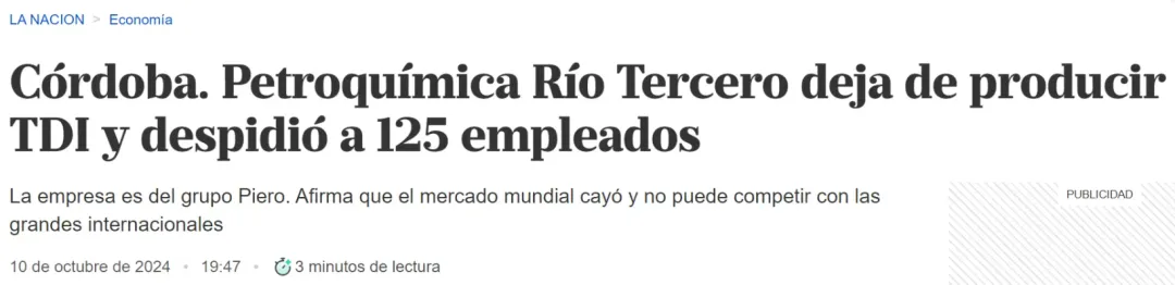 阿根廷Petroquímica Río Tercero公司決定于10月14日起關停其位于科爾多瓦的甲苯二異氰酸酯 (TDI) 工廠,并表示將解雇125名員工。