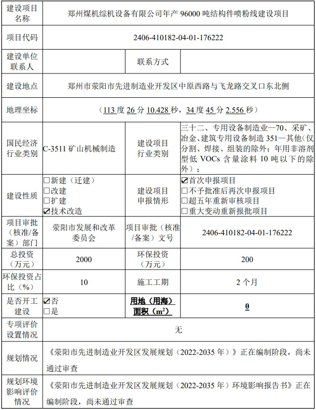 根據(jù)建設(shè)項(xiàng)目環(huán)境影響評價審批程序的有關(guān)規(guī)定,經(jīng)審議,鄭州市生態(tài)環(huán)境局?jǐn)M對鄭州煤機(jī)綜機(jī)設(shè)備有限公司年產(chǎn)96000噸結(jié)構(gòu)件噴粉線建設(shè)項(xiàng)目環(huán)境影響評價文件作出審批意見。為保證審批意見的嚴(yán)肅性和公正性,現(xiàn)將建設(shè)項(xiàng)目環(huán)境影響評價文件的基本情況予以公示。公示期為:2024年09月26日-2024年10月08日(5個工作日)。