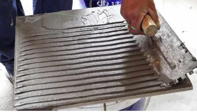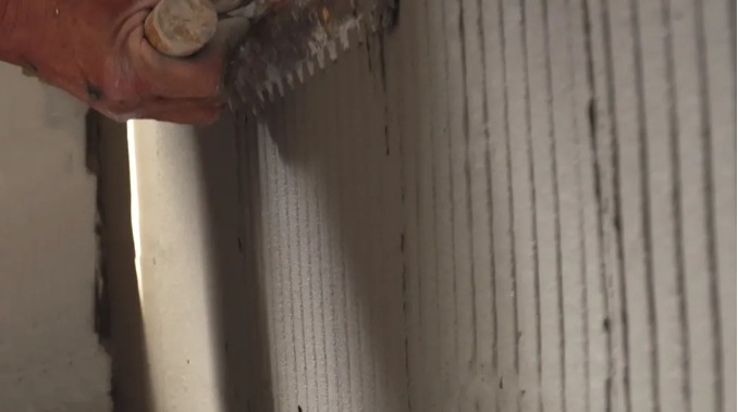 批刮方式是影響滿漿率的重要因素之一。正確做法是先用齒型刮刀的直邊在瓷磚背面和基層刮一層薄薄的膠漿并壓實,確保瓷磚膠與瓷磚和基層充分接觸。然后批抹足量膠漿,并用齒型刮刀梳理齒形膠條。在梳理過程中,保持漿料均勻,刮刀與上膠平面保持45°左右的角度。這樣既不會因角度過小導致膠條過低,也不會因角度過大增加用膠量。