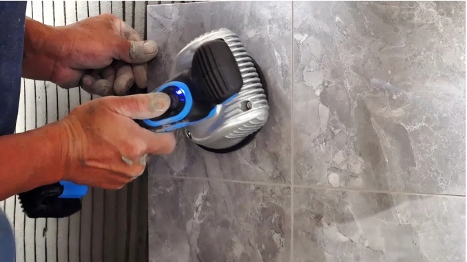 貼磚后應對瓷磚進行揉壓,以排出空氣,確保滿漿率。對于大規格瓷磚,可使用吸盤吸住瓷磚進行揉壓動作,推薦使用電動振動器進行輔助揉壓。用振動器輔助按壓時,應遵循由內向外的順序進行,更有利于空氣排出,從而提高滿漿率。