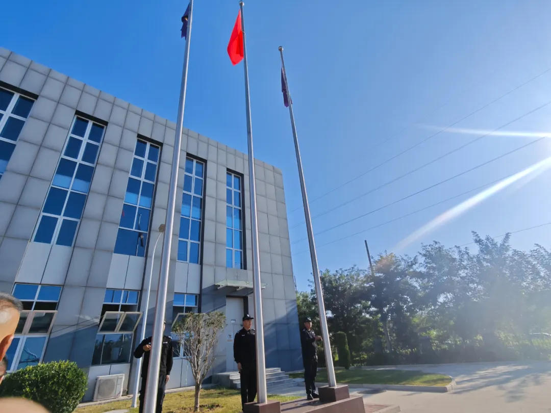 藍(lán)天如洗,白云悠揚(yáng),隨著國(guó)歌聲響起,護(hù)旗手將鮮艷的五星紅旗緩緩升起至旗桿頂端,迎風(fēng)飄揚(yáng)。隨后,展辰旗幟緩緩升起,為30周年儀式增添了濃厚的氛圍。