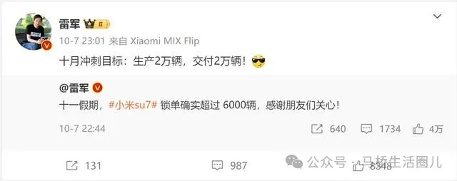 10月7日晚,雷軍在社交媒體上表示,十一假期小米SU7鎖單超過6000臺。同時公布10月目標——生產2萬輛、交付2萬輛。9月,小米汽車交付量超過1萬臺。