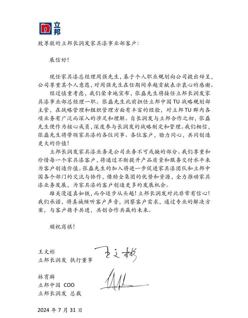 立邦長潤發(fā)宣布,由張磊接任家具漆事業(yè)部總經(jīng)理一職。張磊此前擔(dān)任立邦中國TU戰(zhàn)略規(guī)劃部主管,不僅擁有豐富的戰(zhàn)略管理經(jīng)驗(yàn),還對立邦TU群內(nèi)各項(xiàng)業(yè)務(wù)有著深入的理解和廣泛的涉足。