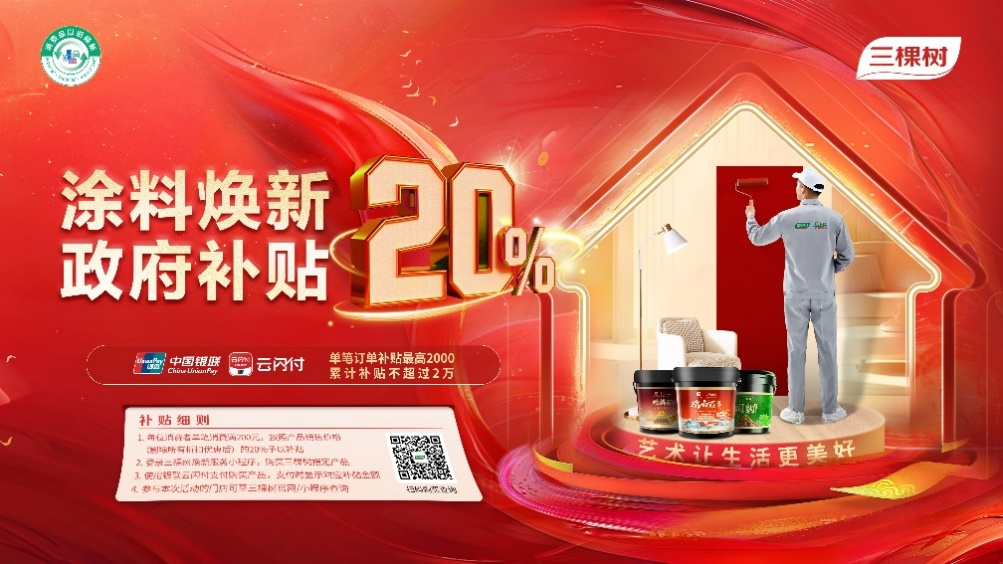 “三棵樹 馬上住 更健康的中國漆”,三棵樹順應(yīng)消費(fèi)市場發(fā)展趨勢,積極參與政府補(bǔ)貼政策,提供健康高品質(zhì)的藝術(shù)涂料產(chǎn)品,并配套專業(yè)涂刷服務(wù),不斷滿足人們對高品質(zhì)理想生活的追求,實(shí)現(xiàn)“住有所居”到“住有優(yōu)居”的品質(zhì)升級。在政府利好政策的強(qiáng)力支撐下,三棵樹將全力支持各項(xiàng)煥新補(bǔ)貼活動(dòng)精準(zhǔn)落地,讓每一位選擇三棵樹的家庭都能享受到實(shí)實(shí)在在的品質(zhì)生活。