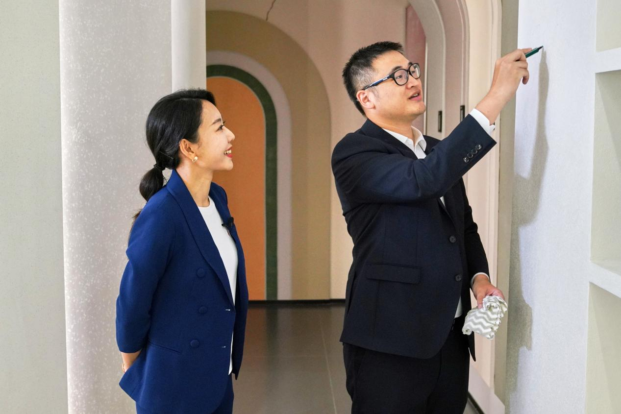三棵樹副總裁洪圣源(右)向記者展示藝術漆墻面的可擦洗性