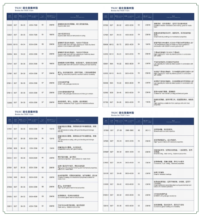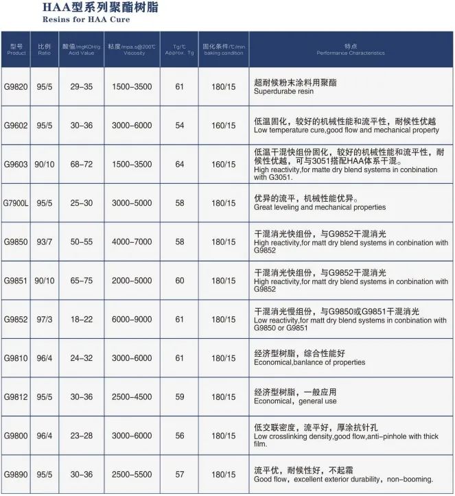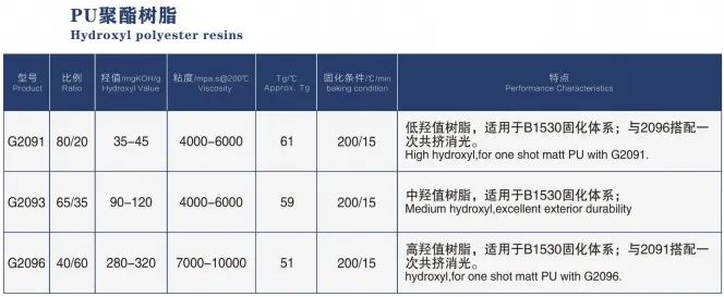 再看PU聚酯樹脂,這一系列產品擁有出色的戶外耐久性,綜合性能良好,流平性能優(yōu)異。HAA型系列聚酯樹脂,具有超耐候的特點,機械性能與流平性俱佳,耐候性極為優(yōu)越,部分產品低交聯(lián)密度、流平效果好。