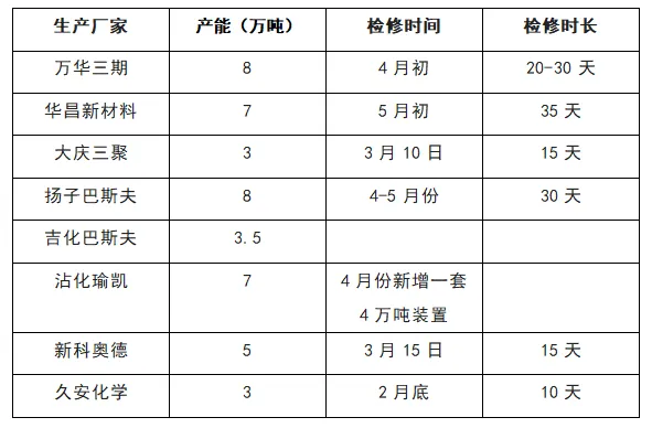 MDI市場,3月歐洲鹿特丹亨斯邁(47萬噸/年)、科思創日本(7萬噸/年)、美國巴斯夫(40萬噸/年)及亨斯邁(50萬噸/年)MDI裝置集中檢修,為期1-2個月。全球MDI供應收縮,國內聚合MDI價格上漲至1.6萬元/噸。