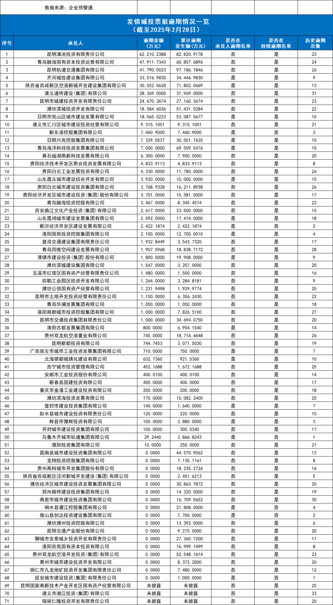 在公布的5314家持續(xù)逾期名單中,涉及71家發(fā)債城投,票據(jù)總逾期余額39.84億元,納入承兌人逾期名單20家,納入持續(xù)逾期名單65家。