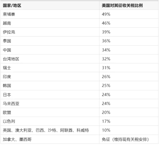 以下是迄今為止已宣布的部分關稅稅率的匯總: