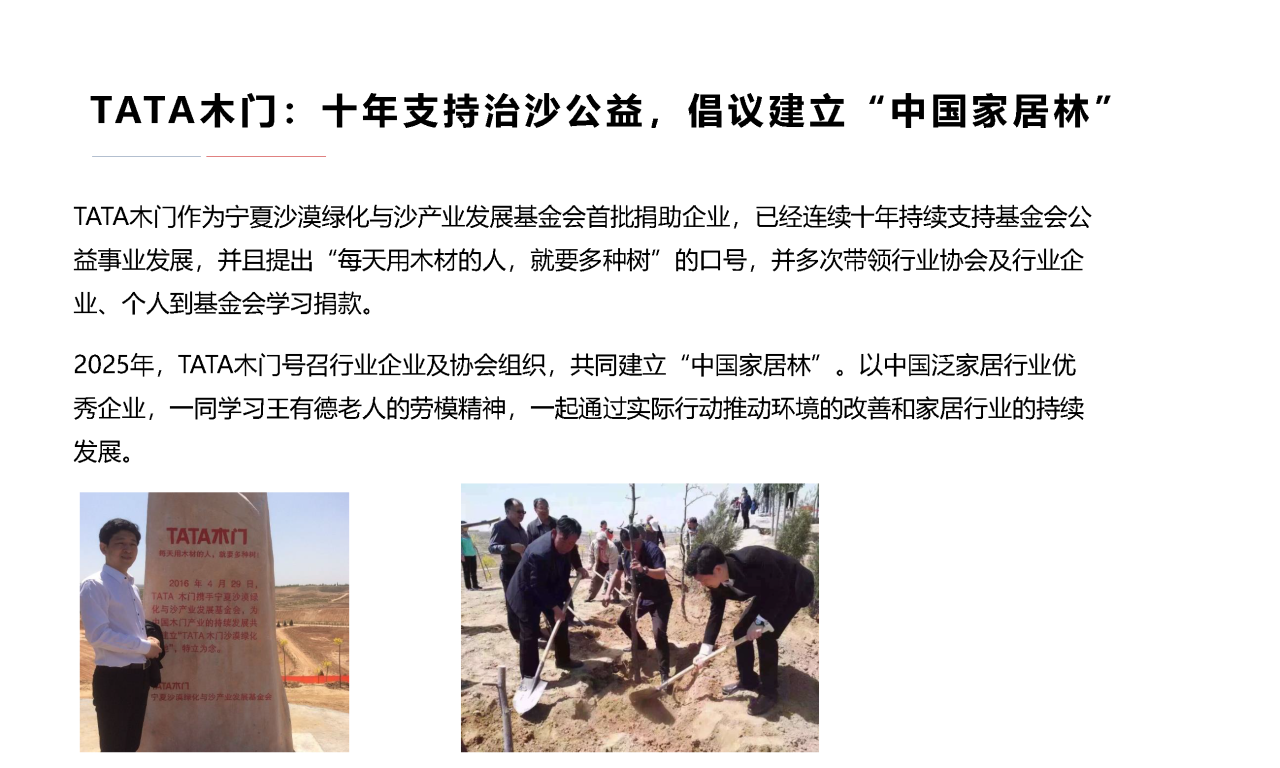 在中國(guó)家居產(chǎn)業(yè)邁向高質(zhì)量發(fā)展的進(jìn)程中,綠色與責(zé)任始終是展辰新材的核心基因。2024年,展辰在成立三十周年之際,在TATA木門(mén)感召下,攜手寧夏沙漠綠化與沙產(chǎn)業(yè)發(fā)展基金會(huì),聯(lián)合上下游合作伙伴,于寧夏銀川靈武市沙漠戈壁啟動(dòng)“展辰生態(tài)守護(hù)林”項(xiàng)目,以行動(dòng)詮釋“綠水青山就是金山銀山”的生態(tài)理念。2025年4月28日,展辰將繼續(xù)以"逐沙繪青綠 共筑生態(tài)夢(mèng)"為初心,聯(lián)合TATA木門(mén)、科寶·博洛尼等家居產(chǎn)業(yè)鏈伙伴,將綠色基因融入產(chǎn)品與行動(dòng),共建"中國(guó)家居林",推動(dòng)家居行業(yè)從“制造”向“智造”與“綠造”跨越,為地球家園播種希望。