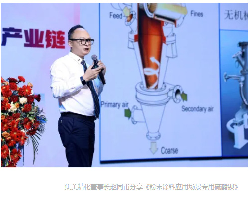 在本次大會現場,作為國內硫酸鋇行業的龍頭企業--集美精化董事長趙同甫應邀出席本次會議,并為參會人員深度分享了《粉末涂料應用場景專用硫酸鋇》。