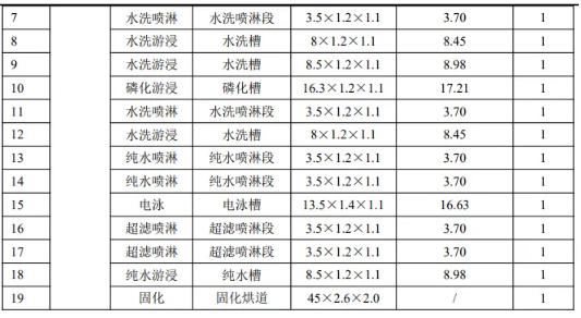 本項目配備全密閉、自動化電泳生產線,生產線槽體均架空敷設,離地高度約 0.6m,生產線設置干濕分離。本項目電泳生產線槽體配置情況如下: