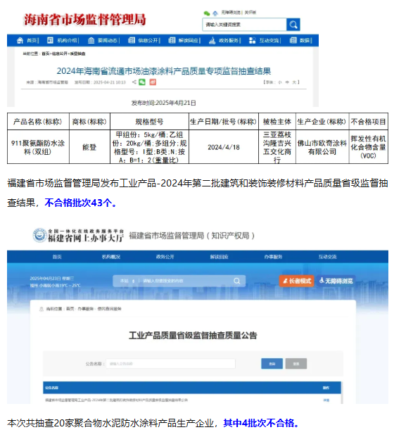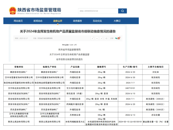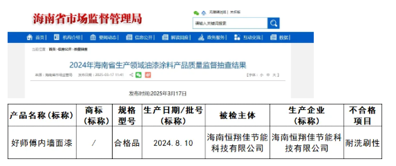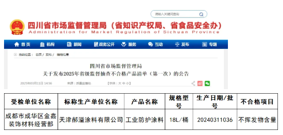四川省市場(chǎng)監(jiān)督管理局發(fā)布2025年省級(jí)監(jiān)督抽查不合格產(chǎn)品清單(第一次),涉及1批次涂料不合格。
