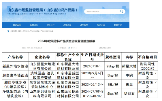 山東省市場(chǎng)監(jiān)管局公布2024年建筑涂料產(chǎn)品質(zhì)量省級(jí)監(jiān)督抽查結(jié)果,涉及4批次涂料不合格。