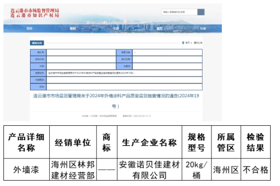 江蘇省連云港市市場(chǎng)監(jiān)督管理局發(fā)布關(guān)于2024年外墻涂料產(chǎn)品質(zhì)量監(jiān)督抽查情況的通告(2024年19號(hào)),1批次涂料不合格。