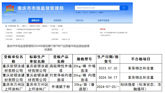 四川省市場(chǎng)監(jiān)督管理局發(fā)布產(chǎn)品質(zhì)量監(jiān)督抽查2025年2月復(fù)查不合格情況公告,涉及涂料2批次。