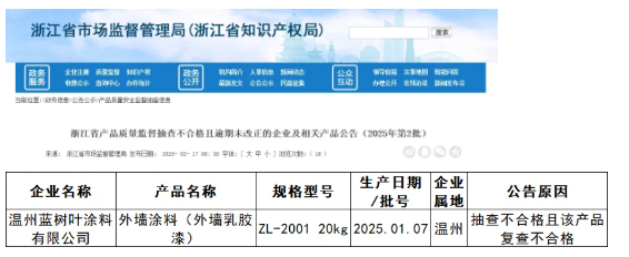 浙江省市場(chǎng)監(jiān)督管理局發(fā)布產(chǎn)品質(zhì)量監(jiān)督抽查不合格且逾期未改正的企業(yè)及相關(guān)產(chǎn)品公告(2025年第2批),涉及不合格涂料1批次。