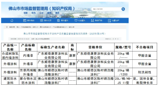 廣東省佛山市市場(chǎng)監(jiān)督管理局公示2024年工業(yè)產(chǎn)品質(zhì)量監(jiān)督抽查結(jié)果,1批次涂料不合格。