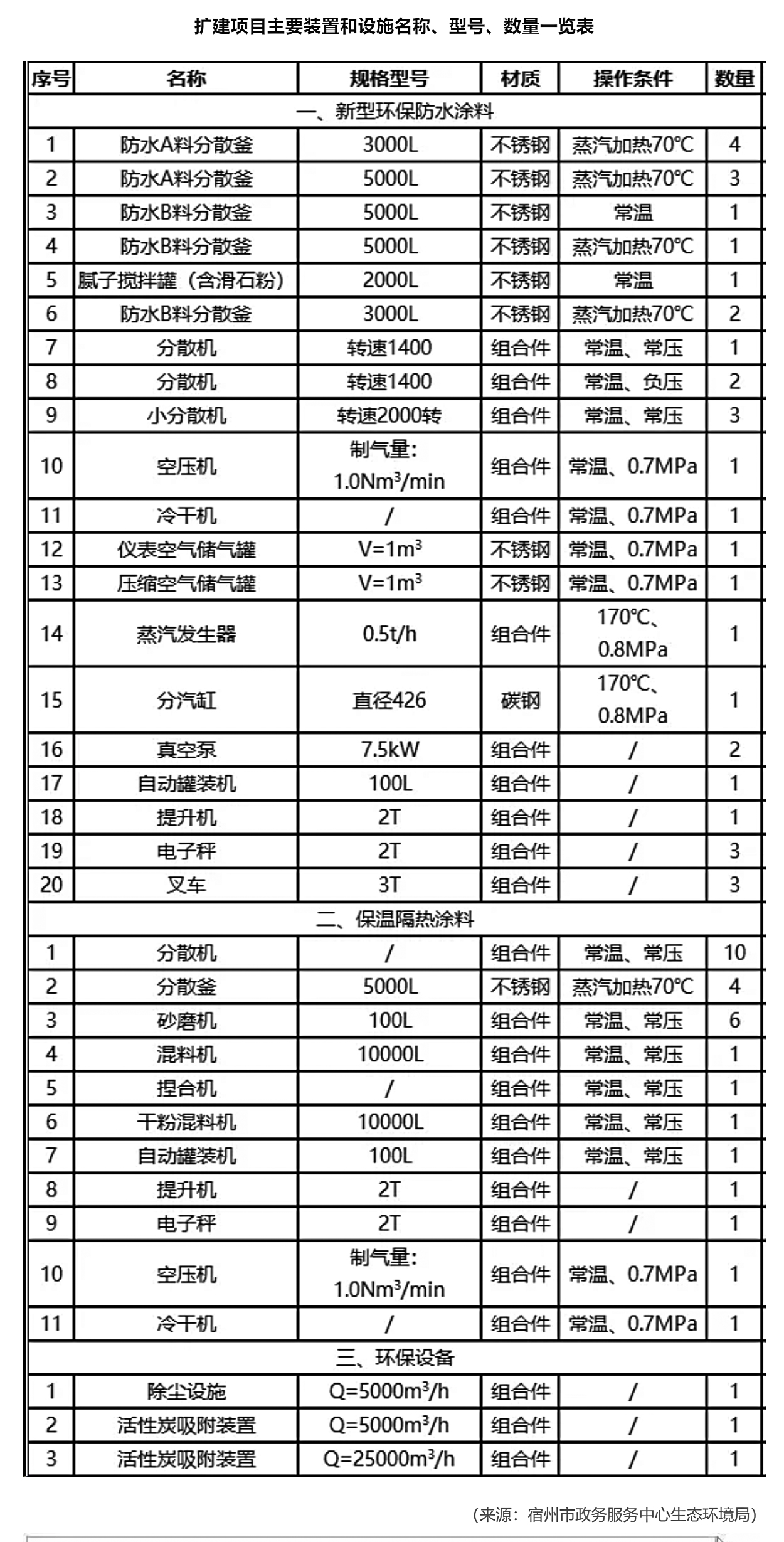 日前,宿州市政務服務中心生態環境局受理安徽新大陸特種涂料有限責任公司《年產30000噸新型環保防水涂料、10000噸保溫隔熱涂料項目》的環境影響評價文件。 據企業公開資料顯示,該項目位于宿州蕭縣化工園區現有廠區內,總投資3600萬元,建設30000噸新型環保防水涂料、10000噸保溫隔熱涂料兩條生產線,形成年產30000噸新型環保防水涂料、10000噸保溫隔熱涂料的生產規模。項目主要原輔材料包括聚醚多元醇、彈性丙烯酸乳液、巖棉、玻璃鱗片等,主要設備攪拌釜、分散機、砂磨機等。
