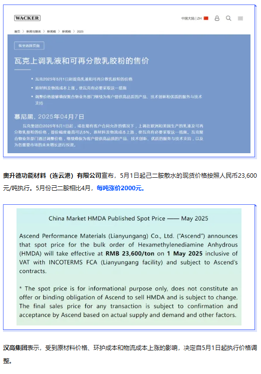 有機(jī)硅巨頭瓦克化學(xué)宣布,從 5月1日起,將對(duì)歐美市場(chǎng)的乳液及乳膠粉價(jià)格進(jìn)行上調(diào),最高漲幅達(dá)5%。