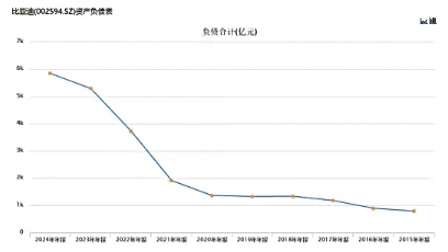 2019年,比亞迪的負債余額是1330.4億元,但到了2024年末,比亞迪的負債已經達到5846.67億元,相當于5年時間增長了3.4倍左右,近10年增長6.36倍。