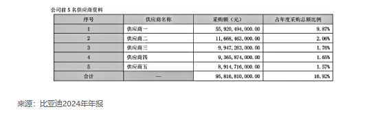 根據比亞迪2024年年報數據顯示,比亞迪前5名供應商的采購金額為958億元,占年度采購總額的16.93%,照此計算,比亞迪年度采購金額近6000億元左右。