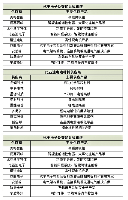 巴斯夫鸚鵡漆為比亞迪提供原廠漆,PPG為比亞迪提供水性中涂產品和修補漆,阿克蘇諾貝爾是比亞迪汽車修補漆的戰略合作伙伴,艾仕得為比亞迪提供水性涂料產品。