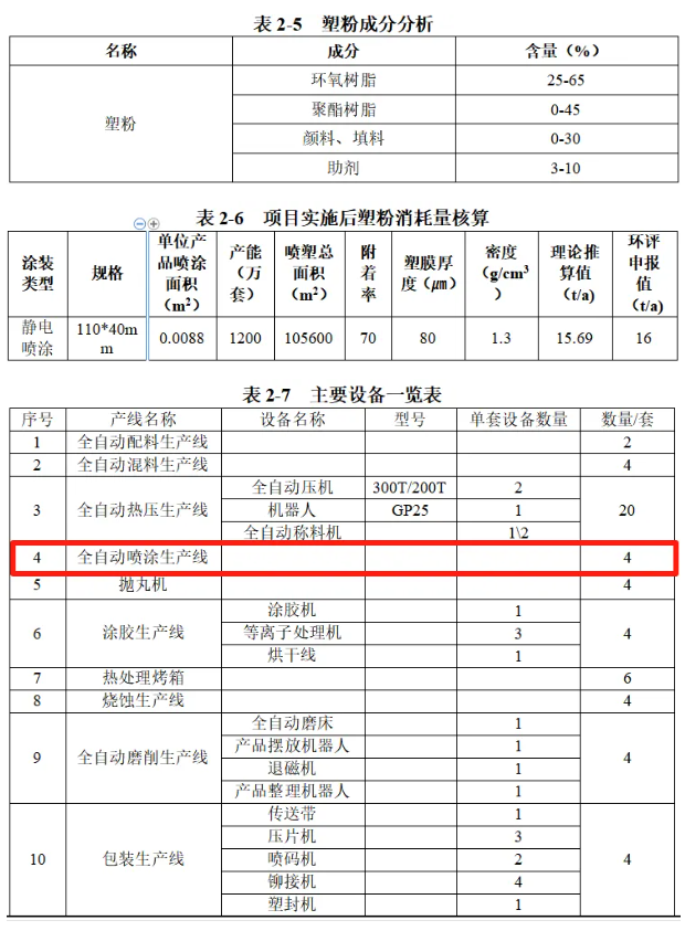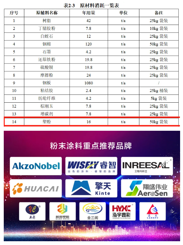 根據(jù)公開信息顯示,該項目配備了4條全自動噴涂線,年消耗塑粉16噸,塑粉成分分析及消耗量核算情況如下表示所示:
