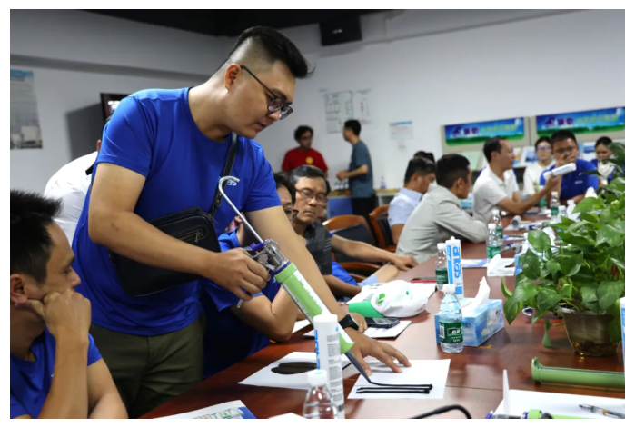 此外,公司特別設置了一個小環節,讓訪客親自體驗新產品——安泰中性硅酮密封膠SK73的性能。