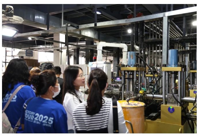 從實驗室步入生產車間,眼前的景象讓考察團感受到蓬勃的生機:螺桿線正高速運轉,智能機械手爭分奪秒地搬運成品,叉車來往不停,展現出一片欣欣向榮的景象。