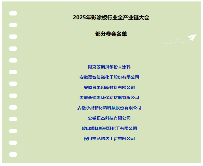 由涂料采購網主辦,廣東睿智環保科技股份有限公司冠名,佛山市德珼爾科技有限公司、深圳市深賽爾股份有限公司共同主協辦的“2025年彩涂板行業全產業鏈大會”將于2025年4月28日在中國金屬板材之都--山東博興召開。