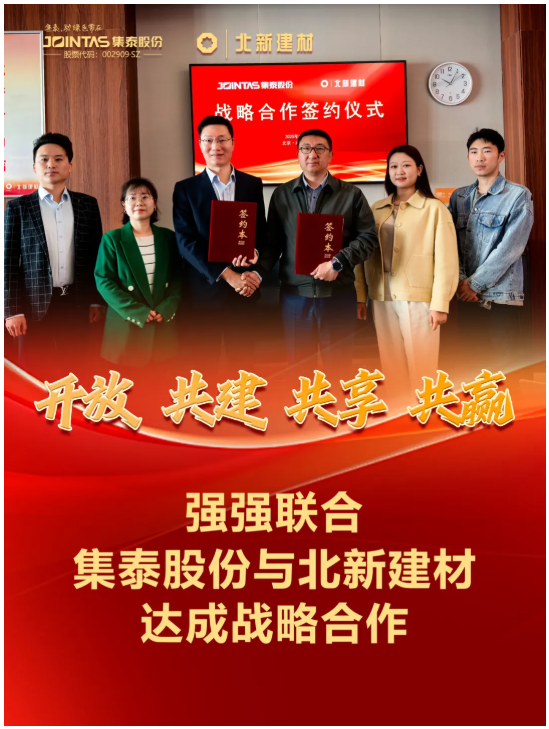 4月10日,集泰股份與北新建材簽署戰略合作協議。雙方將整合資源、優勢互補,共同推動建材行業的發展與進步。