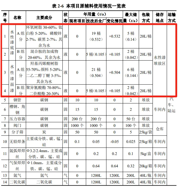 則本項目需 要的水性漆底漆量為0.3308t/a,面漆量為0.3043t/a,共0.6351t/a。 根據企業提供,本項目噴漆工藝上漆率約為 60%(即為損耗 40%),則本項目需要水性漆底漆用量為0.5513t/a、水性漆面漆用量為0.5072t/a,水性漆總用量為1.0585t/a。因此,本項目水性漆總購入量為1.264t/a。
