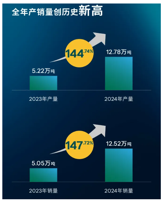 在關鍵財務指標上,麥加芯彩成績斐然。全年營業收入達到21.39億元,同比大幅增長87.56%,成功刷新了成立20多年來的歷史最高紀錄;歸屬于上市公司股東的凈利潤為2.11億元,同比增長26.30%,盈利能力穩步增強;產量和銷量分別提升至12.78萬噸與12.52萬噸,較2023年分別增長144.74%和147.72%,產量、銷量、營收三大核心指標均創歷史新高。這些亮眼的數據不僅彰顯了麥加芯彩過去一年的輝煌成就,也預示著其在未來市場競爭中充滿無限潛力,有望持續引領行業發展潮流,為行業的發展樹立新的標桿。
