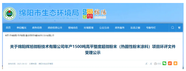 近日,綿陽市生態(tài)環(huán)境局發(fā)布關(guān)于綿陽輝旭微粉技術(shù)有限公司年產(chǎn)1500噸高平整度超微粉末(熱固性粉末涂料)項(xiàng)目環(huán)評文件受理公示。