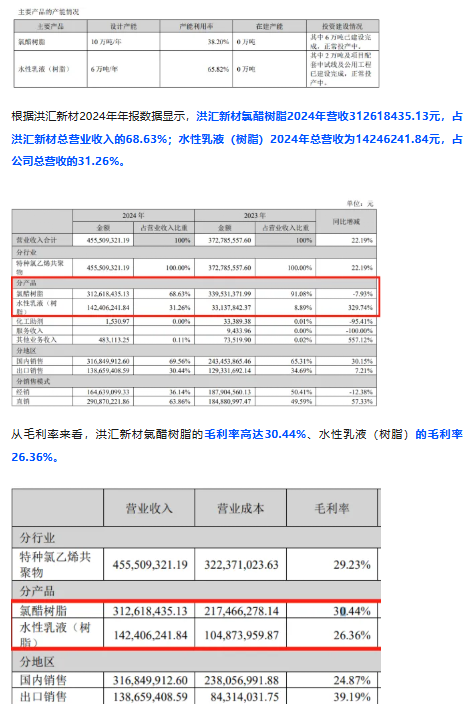 根據(jù)洪匯新材2024年年報(bào)數(shù)據(jù)顯示,洪匯新材氯醋樹脂的設(shè)計(jì)產(chǎn)能為10萬噸/年,產(chǎn)能利用率為38.20%,水性乳液(樹脂)設(shè)計(jì)產(chǎn)能為6萬噸/年,產(chǎn)能利用率為65.82%。其氯醋樹脂產(chǎn)品長期與國外企業(yè)(如德國瓦克集團(tuán)、日本信越化學(xué)工業(yè)株式會(huì)社等)進(jìn)行競(jìng)爭(zhēng)之外,還不斷研發(fā)拓寬產(chǎn)品系列及應(yīng)用領(lǐng)域。