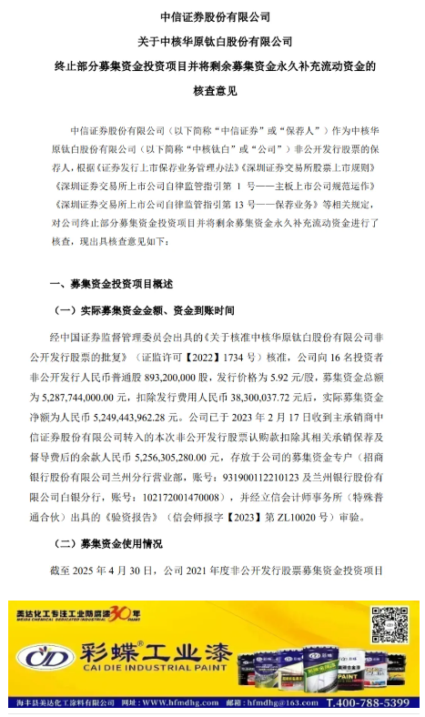 6月2日,中核華原鈦白股份有限公司公告稱,擬終止公司2021年度非公開發行股票之“水溶性磷酸一銨(水溶肥)資源循環項目”及“年產50萬噸磷酸鐵項目”募集資金投資項目,并將剩余募集資金16.66億元永久補充流動資金,用于公司日常生產經營及業務發展。