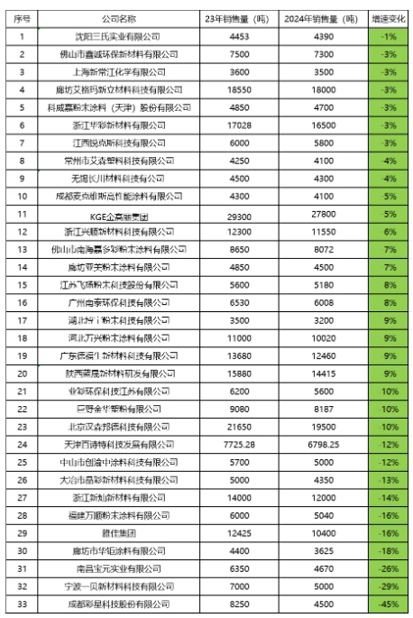 福建萬安、斯耐特、安徽桑瑞斯、麗澤新材料、華江粉末、KGE金高麗集團(tuán)、佐敦銷量分別為36724噸,31500噸、31200噸、31000噸、30030噸、27800噸、26000噸,分別排名在榜單第4~10位,其中除了KEG金高麗集團(tuán)2024年銷量同比下滑5%之外,其它9家企業(yè)的銷量都有所增長(zhǎng)。從排名變化上來看,相較于2023年粉末涂料銷量100強(qiáng),佐敦涂料排名從第17位躍入前十強(qiáng),其銷量同比增長(zhǎng)44%。
