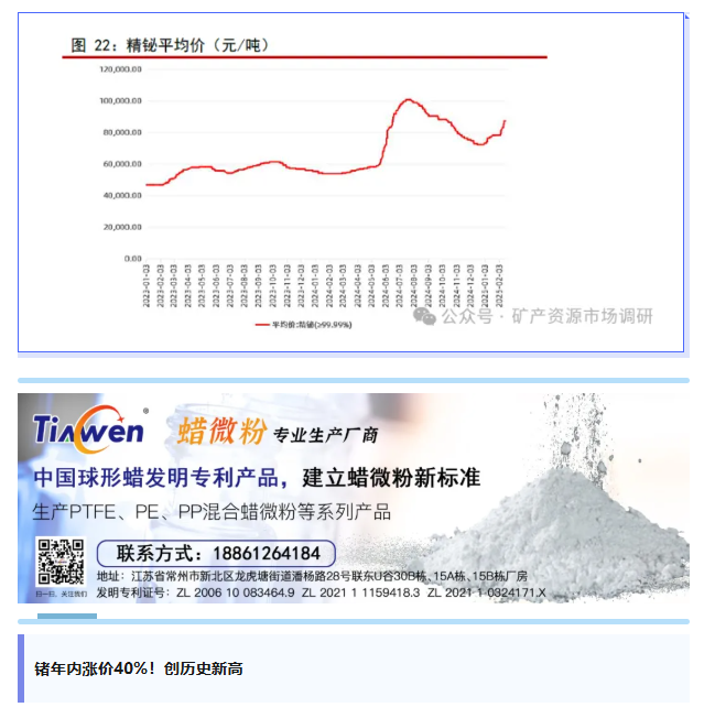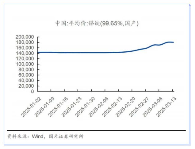 3月中旬,銻(1#)基準價為16.95萬元/噸,與月初相比上漲了13%,較去年3季度價格漲幅超100%,連創歷史新高。從供應端來看,全球銻礦產量從2011年的17.8萬噸/年降至2024年的10.4萬噸/年,整體呈現剛性收縮態勢。俄羅斯銻礦減產53%導致供應缺口持續擴大。海外價格更高,飆升到了42.65萬元/噸,與國內銻價保持著20萬元/噸以上的價差。自2024年9月份我國對銻實施出口管制后,國內外銻價價差迅速擴大,價差正在補漲。