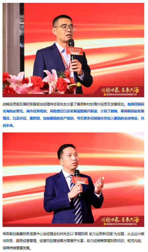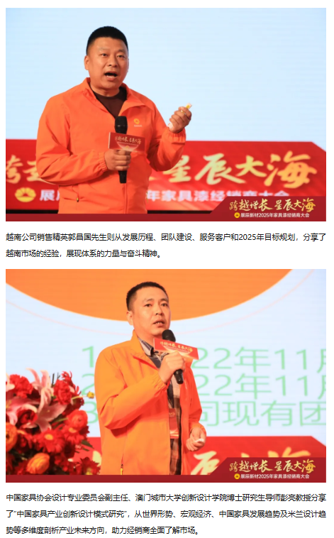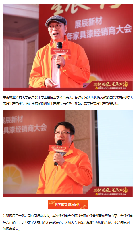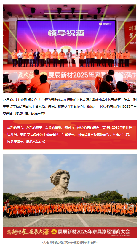 湖南省家具行業協會執行會長兼秘書長劉發剛先生,意大利博托索與弗里杰托涂料股份有限公司董事長兼CEO Mr.Alessandro Bottosso、技術總監Mr.Andrea Frighetto,廣東省涂料與油墨行業協會會長、展辰集團董事長陳冰先生,副董事長陳壽生先生,常務副總裁兼財務信息中心總經理全松林先生,輪值總裁兼華東公司總經理劉順先生,副總裁兼北方公司總經理劉華東先生,珠海工廠及海外公司總經理李旭汕先生,膠粘劑事業部總經理周言明先生,戰略投資部及國際貿易部總經理肖志軍先生,人事行政中心總經理熊焰女士,技術管理中心總經理劉志剛先生,生產供應中心總經理肖勁先生,市場營銷中心總經理楊求貴先生,產品管理中心副總經理劉寶山先生等嘉賓及領導,與經銷商代表們歡聚一堂,共同回顧2024年攜手走過的不凡征程,展望2025年的宏偉藍圖,攜手同心,全面開啟2025年的新征程。