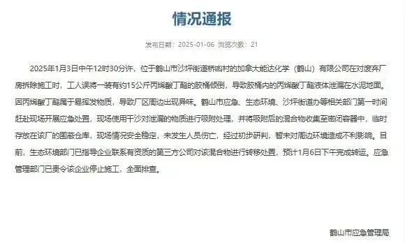 1月3日,位于鶴山市沙坪街道橋凼村的加拿大能達(dá)化學(xué)(鶴山)有限公司在對(duì)廢棄廠房拆除施工時(shí),工人誤將一裝有約15公斤丙烯酸丁酯的膠桶傾倒,導(dǎo)致膠桶內(nèi)的丙烯酸丁酯液體泄漏在水泥地面。