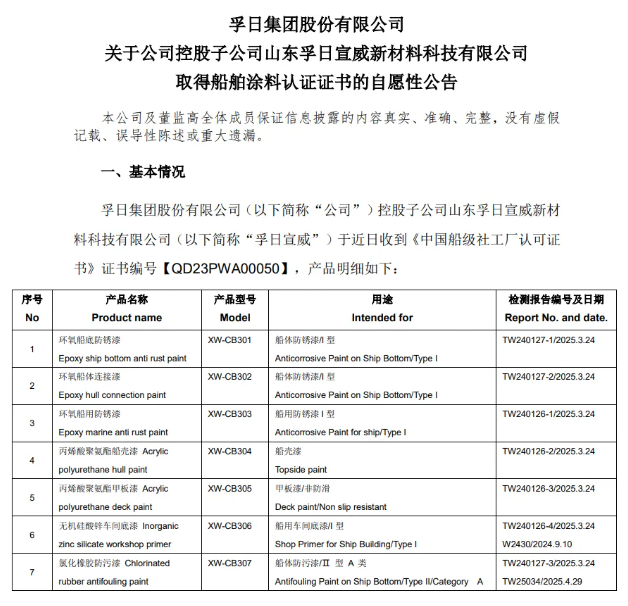船舶涂料因其品種繁多、認證流程復雜以及測試周期較長,一直是防腐涂料難度較大的領域之一。據悉,孚日股份此次成功獲得了包括環氧船底防銹漆、環氧船體連接漆、環氧船用防銹漆等在內的7款船舶涂料產品的認證。這不僅標志著其產品在性能、質量和環保等關鍵指標上已通過嚴苛檢驗,達到行業認可的高標準,更為公司打開船舶涂料市場大門提供了關鍵的“鑰匙”。
