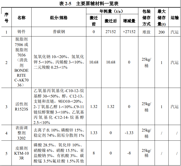 項目電泳槽配備“超濾設備”對電泳槽液進行超濾回收處理,項目電泳漆利用率約為95%,剩余的5%形成超濾濾渣和沾至掛具上電泳廢渣一起按危廢處置。本項目電泳漆固體分總量約為5t。則項目電泳渣產生量約為0.25t,附著在工件上的物料為4.75t。與本項目實際年用量基本相符。