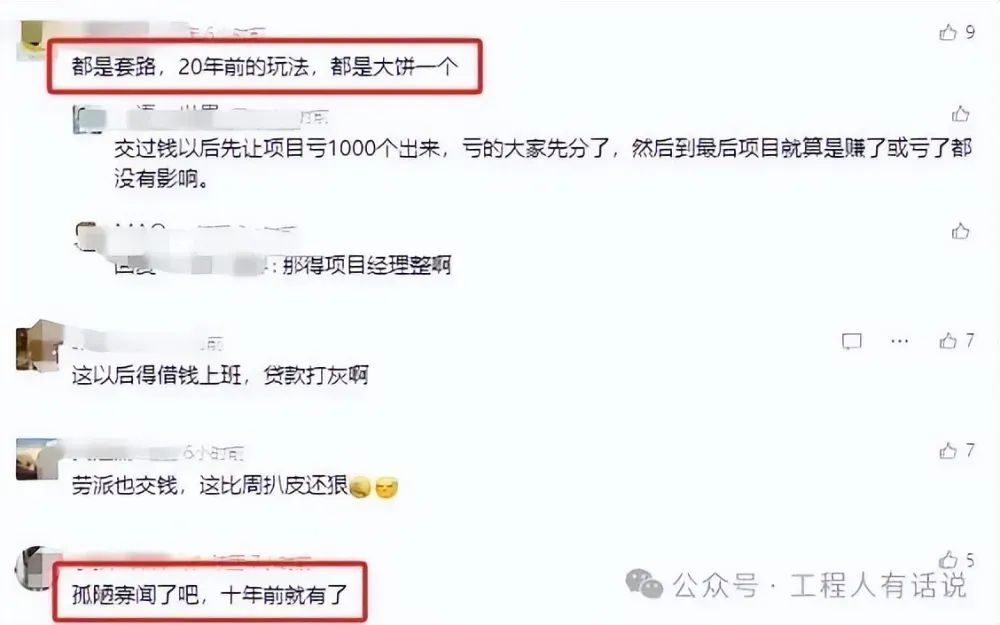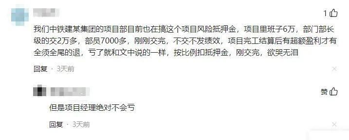 某網(wǎng)友還透露,中鐵建某集團的項目部也在推行項目風險抵押金制度,項目班子需繳納6萬,部門部長級交2萬多,部員7000多,同樣存在“不交不發(fā)績效”的情況,進一步印證了此類現(xiàn)象在行業(yè)內(nèi)的蔓延。