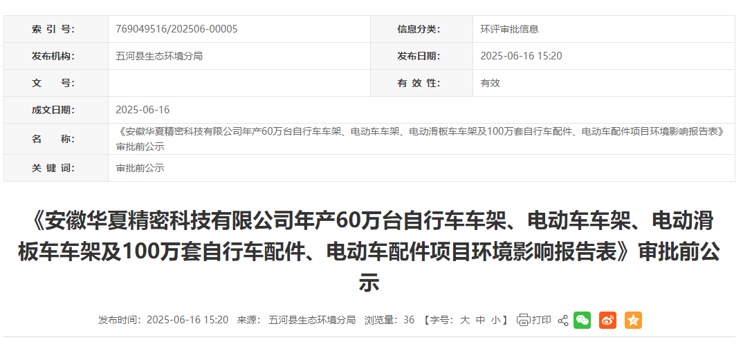 項(xiàng)目名稱:安徽華夏精密科技有限公司年產(chǎn)60萬(wàn)臺(tái)自行車車架、電動(dòng)車車架、電動(dòng)滑板車車架及100萬(wàn)套自行車配件、電動(dòng)車配件項(xiàng)目