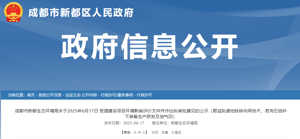 近日,成都市新都區人民政府發布關于2025年6月17日受理建設項目環境影響評價文件并作出擬審批意見的公示(君誠軌道地鐵轉向架技術、若克石油井下裝備生產研發及油氣田)。