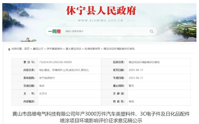 近日,休寧縣生態(tài)環(huán)境分局發(fā)布黃山市昌維電氣科技有限公司年產(chǎn)3000萬件汽車類塑料件、3C電子件及日化品配件噴涂項目環(huán)境影響評價征求意見稿公示。