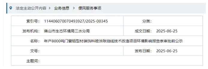 近日,佛山市生態(tài)環(huán)境局三水分局發(fā)布年產(chǎn)8000噸門窗鋁型材裝飾料噴涂除油線技術(shù)改造項(xiàng)目環(huán)境影響報(bào)告表審批前公示。
